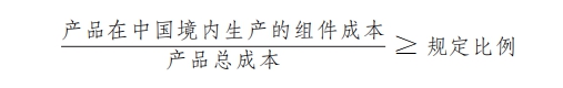 产品在中国境内生产的组件成本占比应当达到规定比例,计算公式为: